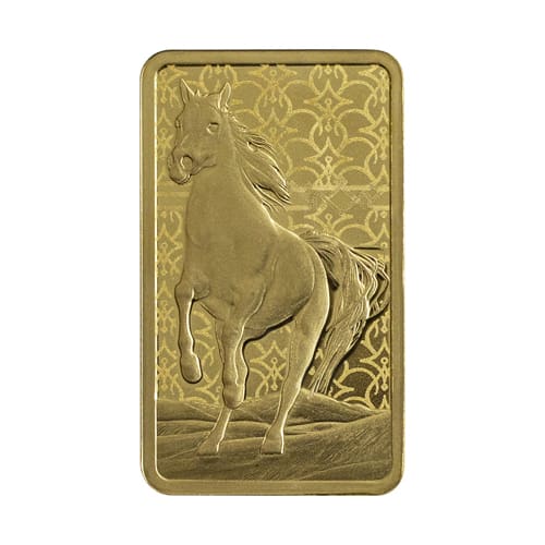Celebrate elegance and freedom with this PAMP Suisse 5 gram .9999 fine gold bar featuring a majestic Arabian horse design, presented in a pendant frame for display or wear.